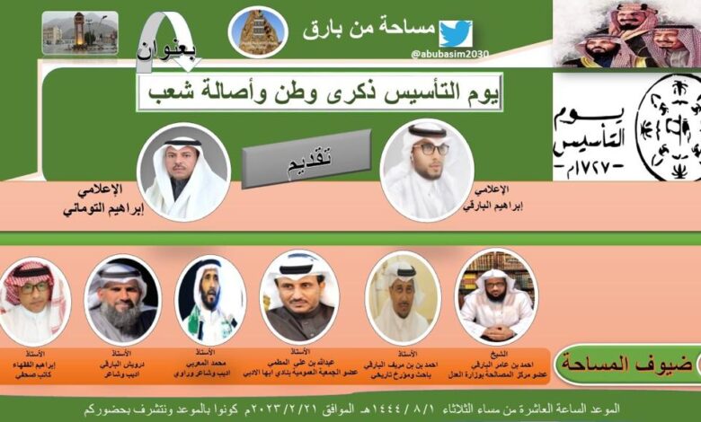 ندوة بعنوان “يوم التأسيس ذكرى وطن وأصالة شعب” تقيمها ثقافية جمعية بارق للتراث
